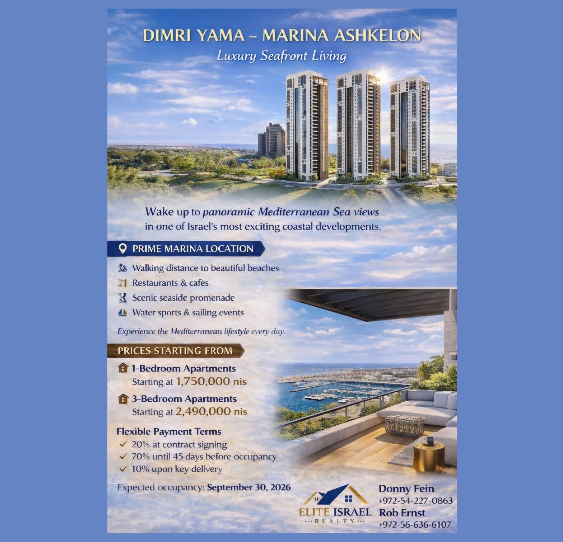 Wake up to panoramic Meditteranean Sea views in one of Israel's most exciting coastal developments.