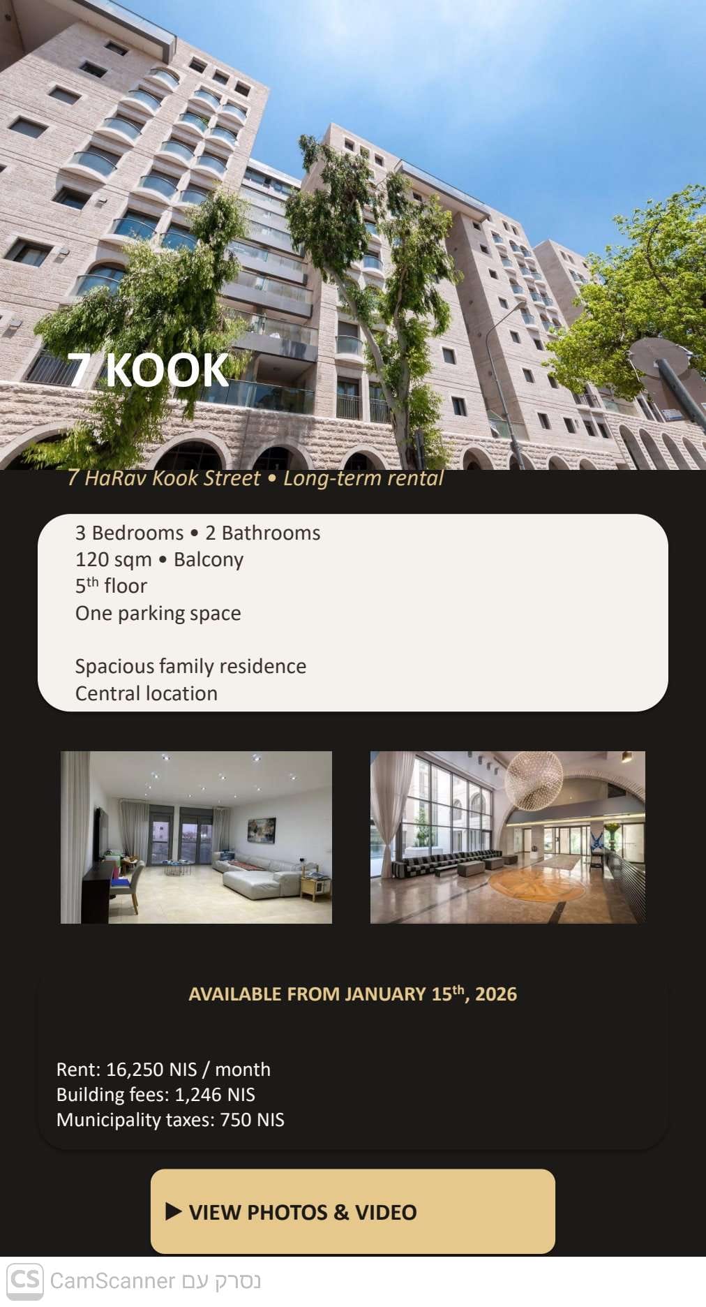 Rent: 16,250 NIS/month