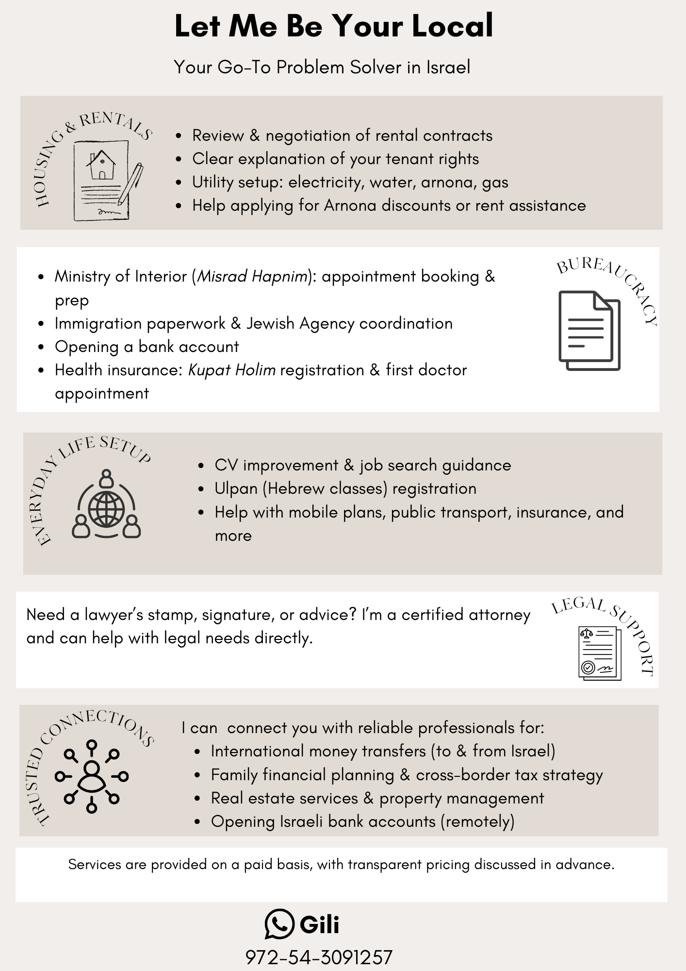 I help Olim and expats with rentals, utilities, bureaucracy, bank accounts, health insurance, Ulpan, and more. Clear guidance, hands-on support, and trusted connections.